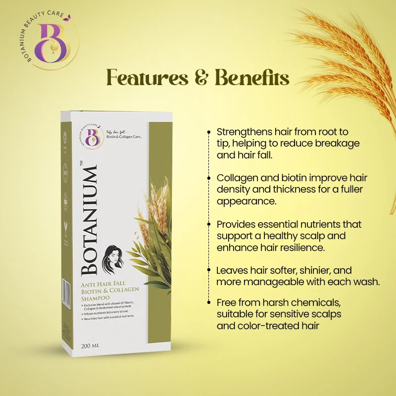Botanium Biotin and Collagen Anti-Hair Fall Shampoo offers a complete approach to support hair strength, volume, and health, helping you achieve stronger, fuller hair with each wash.
