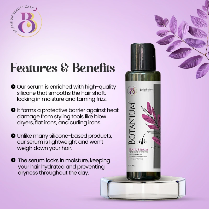 The Botanium Silicone Hair Serum is expertly crafted to provide your hair with intense shine, smoothness, and protection. Here are its standout features: